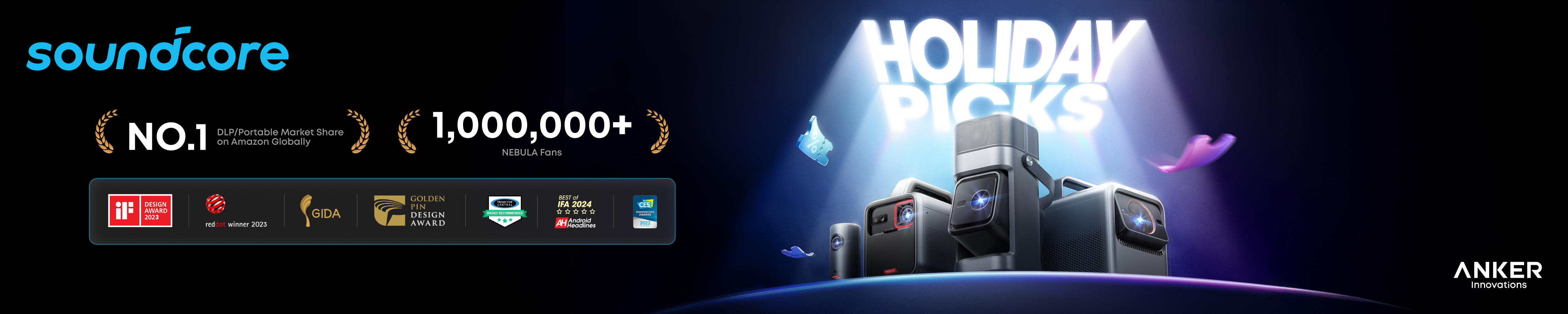 soundcore Nebula P1 Portable GTV Projector with Detachable Speakers, 650 ANSI Lumens, 1080P, 20W Truly 2.0 Surround Sound, Dolby Audio, Built-In Gimbal, Auto Adjustment, 180" Big Screen, Carry Handle